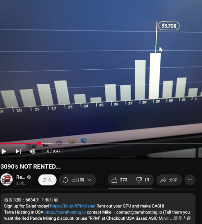而在近幾個月裡、我們也看到了零散算力的租賃市場出現了異常並且有週期性的活力,例如RedPanda Mining在今年二月初就使用了在歐美非常受歡迎的顯卡算力租賃平台「Salad」來出租算力,據他所說由他組的 3090顯卡整機,單日收益最高有達到 5.7美元,這已經遠遠超過單純挖 PoW 幣的收入了,這代表越高階顯卡在現在的時代,擁有更多的多角化營利與抵抗折舊的能力。